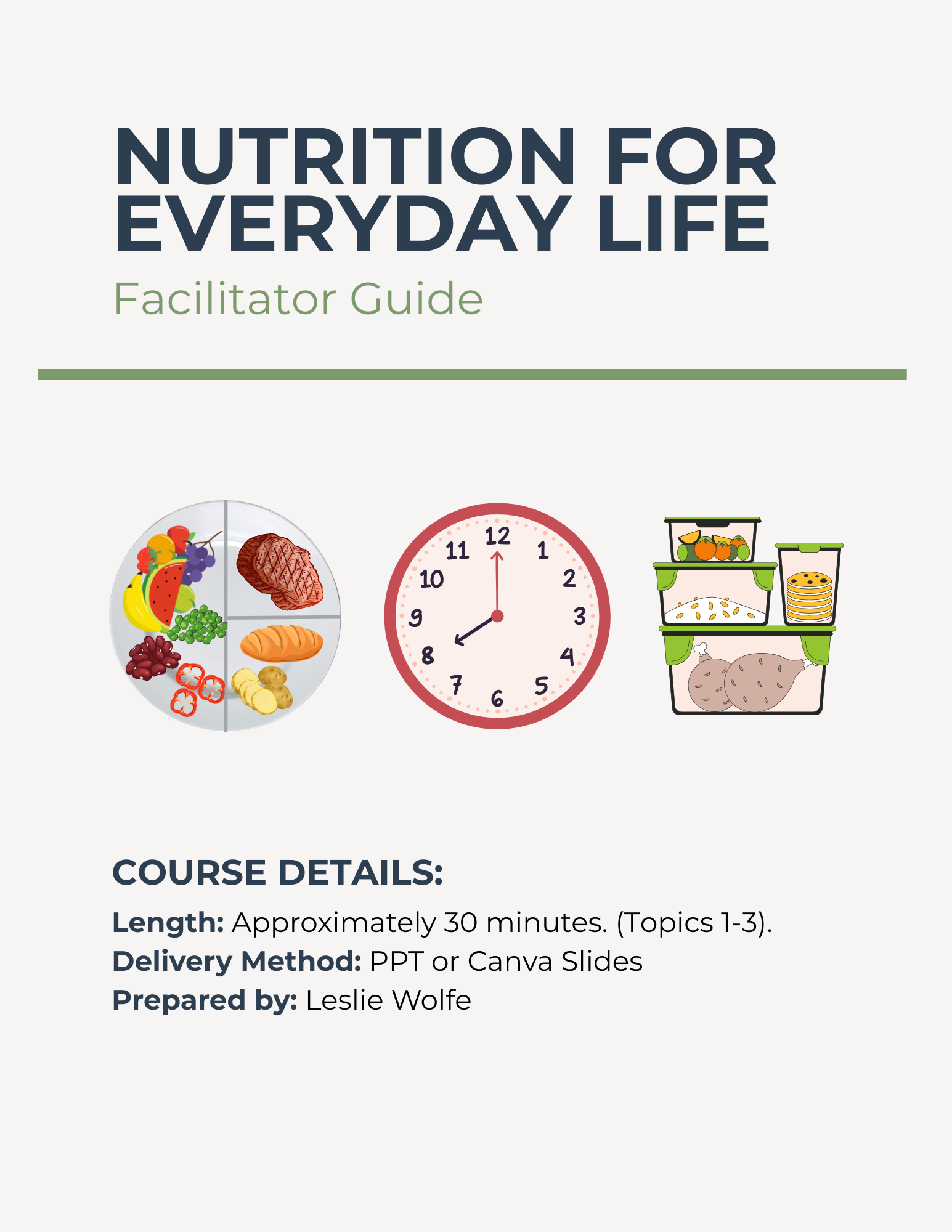 A three-part instructor-led training package for the first three topics in the Nutrition for Everyday Life series: Balanced Plate, Meal Timing, and Meal Prep. This ILT sample demonstrates my ability to design cohesive facilitator materials, participant workbooks, and accessible slide decks for adult learners.